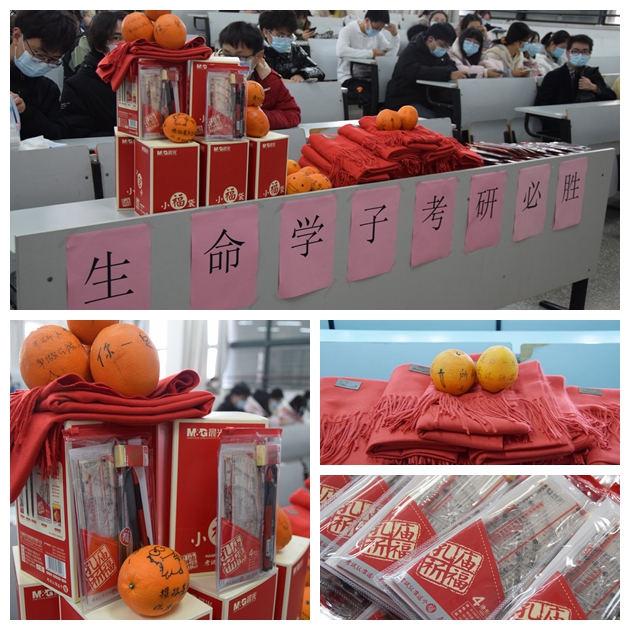 会上,就业辅导员张晓作后勤服务介绍,表明公司对考研工作的大力支持,为考研学子献上了“定心丸”。会后,公司还为研友们送出了考研大礼包——内含一份文具福袋,祝大家福星高照!包含一条红围巾,祝大家鸿运当头!还有一个维C含量极高的橙子,祝大家健健康康、马到成功!