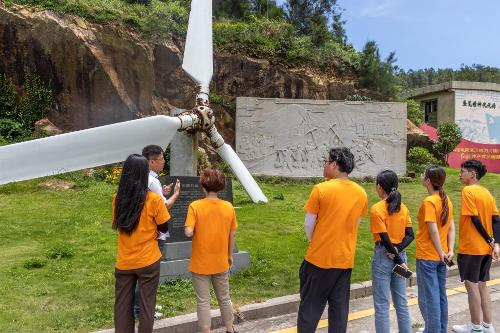 随后,实践队抵达电力国网浙江台州市椒江区供电公司大陈供电所。大陈发电厂作为大陈岛上第一座也是唯一一座发电厂,见证了三代电力“垦荒人”的艰苦奋斗,是岛上的电力守望者。在“垦二代”劳模王海强的带领下,实践队调研了大陈“三色三地”电力垦荒文化示范区建设情况,实地考察了“大陈发电车间”、电力文化遗址,进一步了解了大陈电力垦荒史。大陈岛历经限时限区供电、“柴油+风能”全天供电、陆岛联网供电三个阶段,现已开启海岛“绿氢”综合能源供应。王海强表示,大陈岛百千瓦级氢能综合利用工程,借助岛上现有的风力发电,用水制氢,不仅是100%绿色能源,还可以有效保障岛上居民用水以及重要场所紧急用电。队员们深深地感受到,大陈岛成为东海明珠离不开电力垦荒人的科技探索,同时树立了开拓创新的垦荒精神。