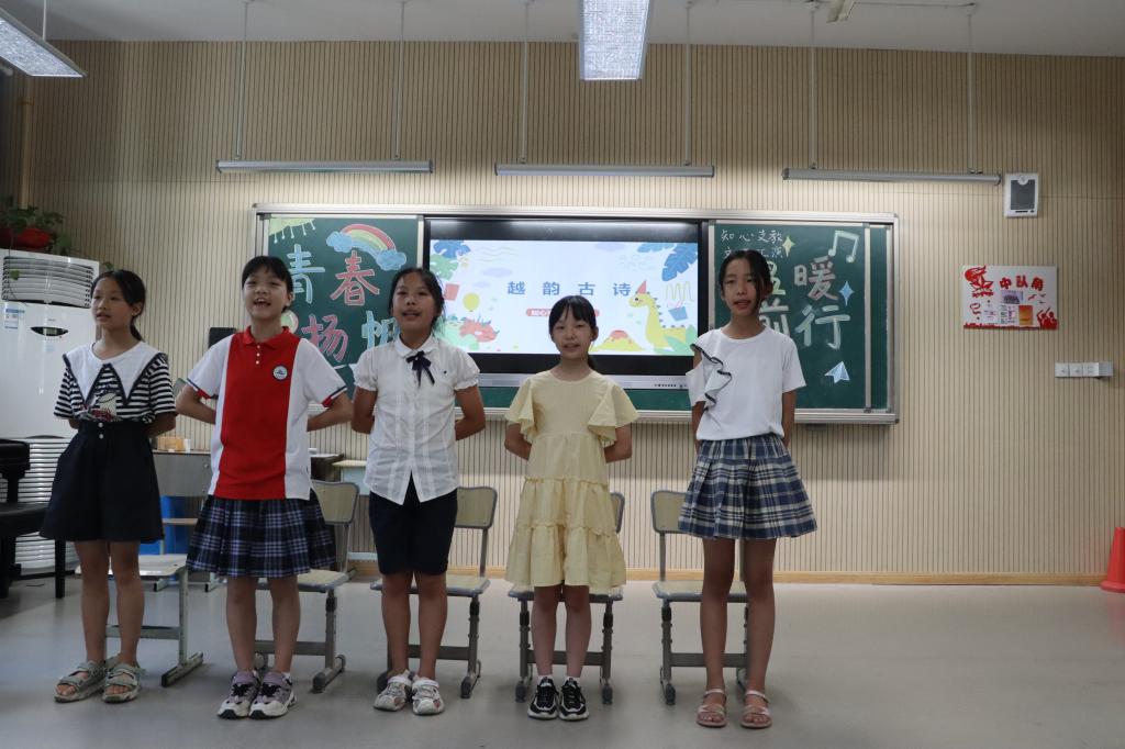 王鑫怡和蒋铭宸两位主持人宣布文艺汇演正式开始,首先开始的是团队画报展示,每一个小组分别介绍自己的小组名字、小组口号和小组成员,接着由小组代表介绍小组做的作品。然后,大家开始表演舞蹈《青春修炼手册》、课本剧《滥竽充数》、越韵古诗《赋得古原草送别》、集体朗诵《请党放心,强国有我》、合唱《明天会更好》。在游戏环节,实践队员和小员工们配合默契、乐趣横生。汇演最后进入颁奖环节,实践队员根据前几天的积分排名,给每一个小组相应的奖励。