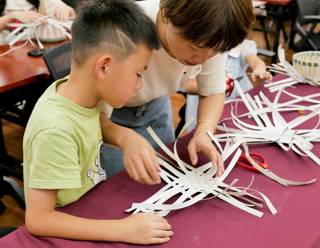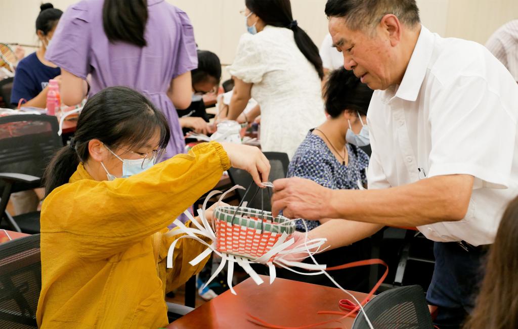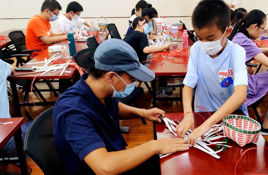 在简短的开场介绍后,林阿芳首先向大家展示并介绍了他的家用编织篮作品,大小不一、造型精美的编织篮展现出独运匠心的工艺,大家满心期待、跃跃欲试。随后,每人领取了一把长短不一、颜色各异的编织带,并在林阿芳的指导下,认真编织起来。不论是老师,还是员工,亦或者小朋友,大家都全神贯注地编织着,编织带在他们的手里旋转、交错,不多时便初具雏形。当然,初学者们的编织学习也并非一帆风顺,但经林阿芳耐心细致地教学,困难也被逐一化解。最终,一个个形态各异的编织篮在各自的努力下新鲜出炉,活动在大家心满意足的欢笑声中圆满结束。