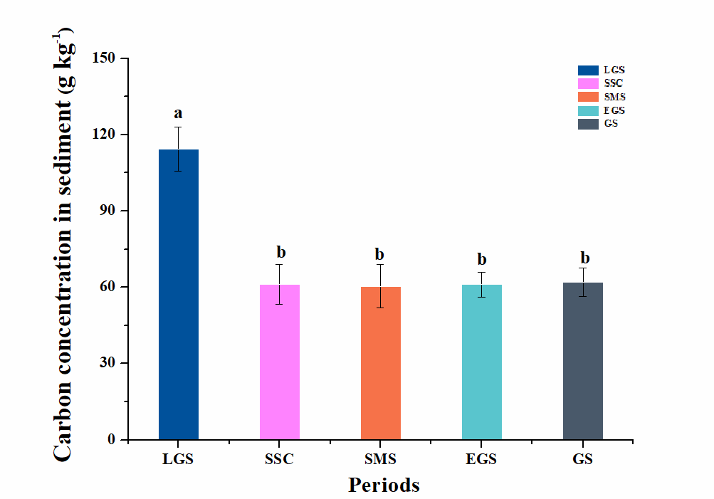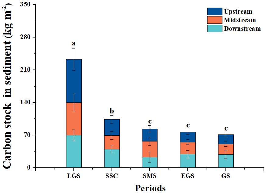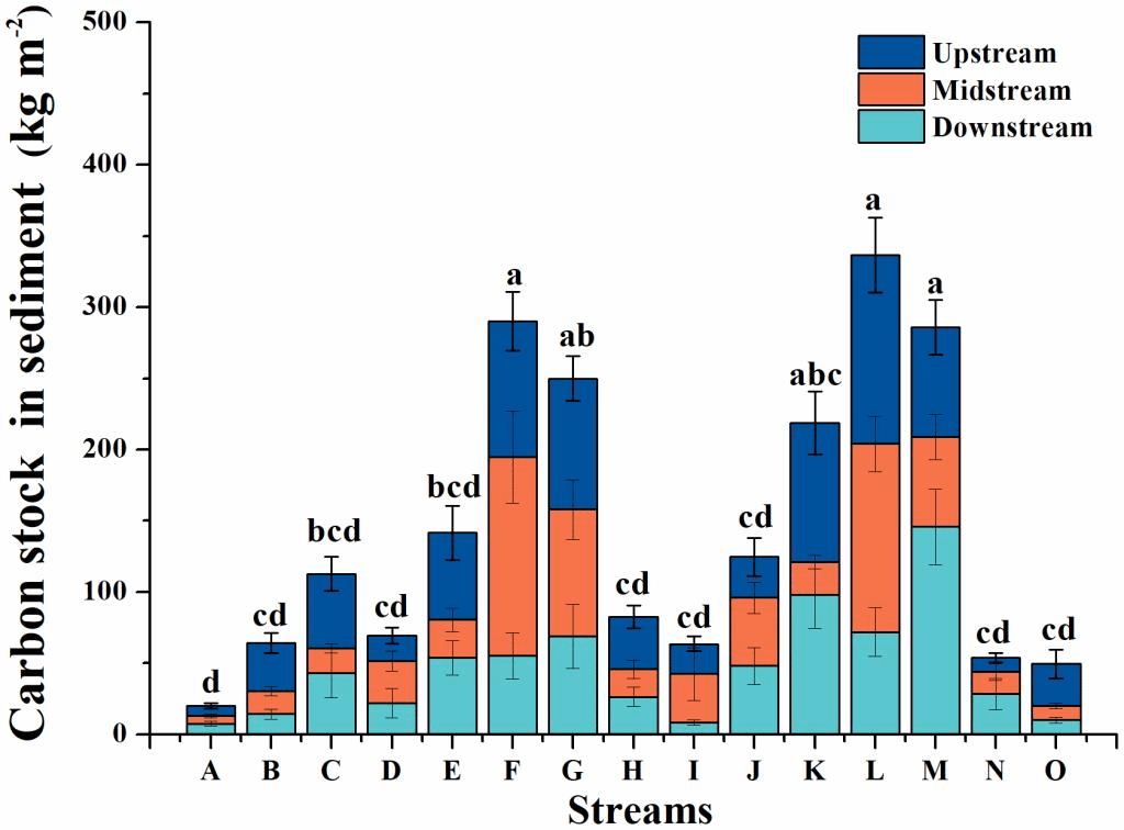 森林溪流中,90%的有机碳储存在沉积物中,在全球碳循环中起着至关重要的作用。虽然森林溪流广泛分布在不同的森林区域,但森林沉积物有机碳的季节动态尚未得到充分研究。本文在四川长江上游亚高山针叶林流域,选取15个代表性森林溪流,对其水体沉积物中0-5 cm的有机碳进行了5个关键时期的采样,并分别为融雪期、生长季早期、生长期、生长季后期和季节性雪被期进行了为期一年的调查,并采用重铬酸钾外加热法测定其有机碳浓度。结果发现在为期一年的调查中,15条河流在5个关键时期的沉积物有机碳浓度范围为6.39 ~ 458.93 g kg- 1,平均值为4.56 g kg- 1。相应的,其有机碳储量在2.05 ~ 310.56 kg m−2之间,平均值为46.03 kg m−2。各溪流的最大和最小有机碳储量分别在生长季后期和融雪季。各溪流上游、中游和下游沉积物有机碳储量分别为1.31 ~ 218.05、1.29 ~ 182.64和0.99 ~ 190.38 kg m−2,平均值分别为39.36、36.58和37.93 kg m−2。在5个关键时期,上游和下游碳储量的平均比值在0.10 ~ 6.31之间,平均为1.43,这表明森林水体沉积物可能具有重要的碳源作用。此外,通过回归分析发现,季节变化主要受降水、温度、沉积物深度和凋落物碳输入共同调控。这些发现表明,森林河流成分可能在亚高山森林及其邻近河流的碳地球化学循环中起着至关重要的作用。