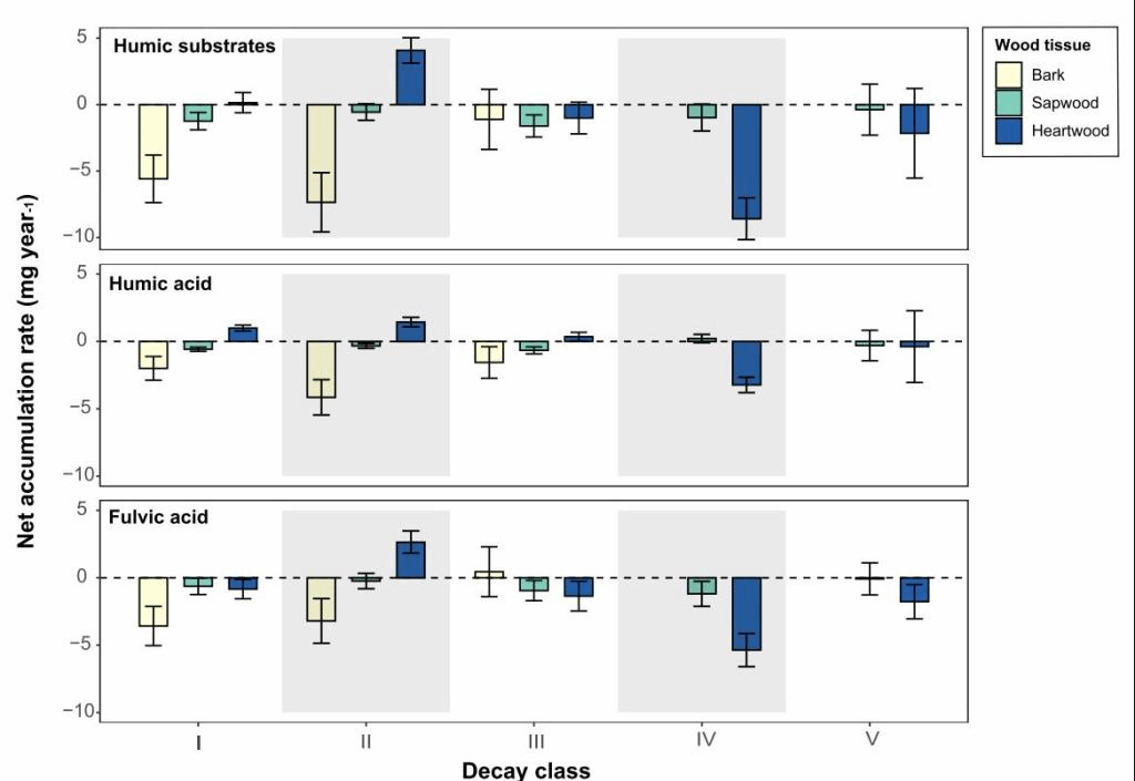 倒木在生物多样性保育、涵养水源、森林更新以及森林碳和养分循环等方面发挥着十分重要的作用。倒木在森林生态系统中的储量巨大,其碳储量几乎是凋落物碳储量的两倍。倒木缓慢的分解速率和持续的碳和养分输入对土壤有机质的积累具有显著的积极作用。当前的研究强调倒木木质特性对倒木分解速率具有较强的影响,而对倒木腐殖化过程的影响缺乏必要的关注。亚高山森林生态系统自然干扰频繁,倒木储量较大,土壤较为贫瘠,研究该生态系统中倒木腐殖化特征及影响因素对理解倒木分解和土壤有机质的形成具有重要的意义。我们的研究表明,倒木树皮、边材和心材的腐殖化过程差异显著,且边材的腐殖化过程最长。倒木基质质量对树皮腐殖化过程的影响作用较小(解释度2-16%),对边材腐殖化有显著影响(解释度18-43%)。木质素含量和以N和P养分状况为主的养分状况是影响倒木腐殖化的主要因素。我们的研究证实了木质素来源的有机质对土壤有机质的形成具有重要作用,较高比例的倒木边材可能亚高山森林土壤有机质的形成和积累具有积极作用。