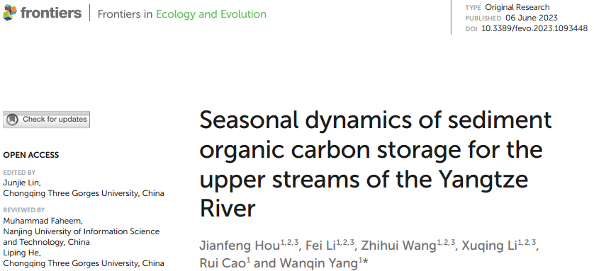 研究团队在环境与生态学领域期刊《Frontiers in Ecology and Evolution》发表了题为“Seasonal dynamics of sediment organic carbon storage for the upper streams of the Yangtze River”(长江上游森林溪流沉积物有机碳储量的季节动态)的研究论文。侯建峰博士为该论文第一作者,杨万勤教授为通讯作者。