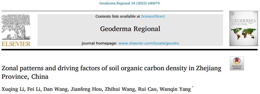 研究团队在土壤学领域期刊《Geoderma Regional》发表了题为“Zonal patterns and driving factors of soil organic carbon density in Zhejiang Province, China”(浙江省土壤有机碳密度空间变化和驱动因素)的研究论文。实验员李旭清为该论文第一作者,杨万勤教授为通讯作者。