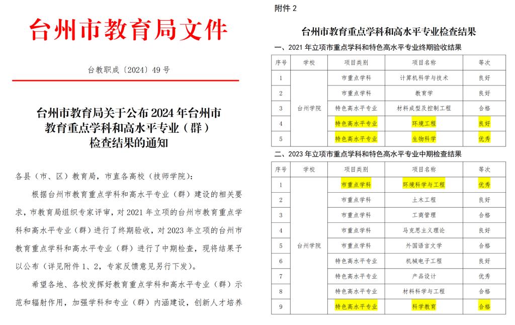 5月15日,台州市教育局公布了2024年台州市教育重点学科和高水平专业(群)检查结果,意昂的生物科学专业、环境工程专业2项市特色高水平专业分别以优秀、良好的成绩通过终期验收,市重点学科—环境科学与工程和市特色高水平专业—科学教育专业通过中期检查,其中,环境科学与工程成绩优秀。