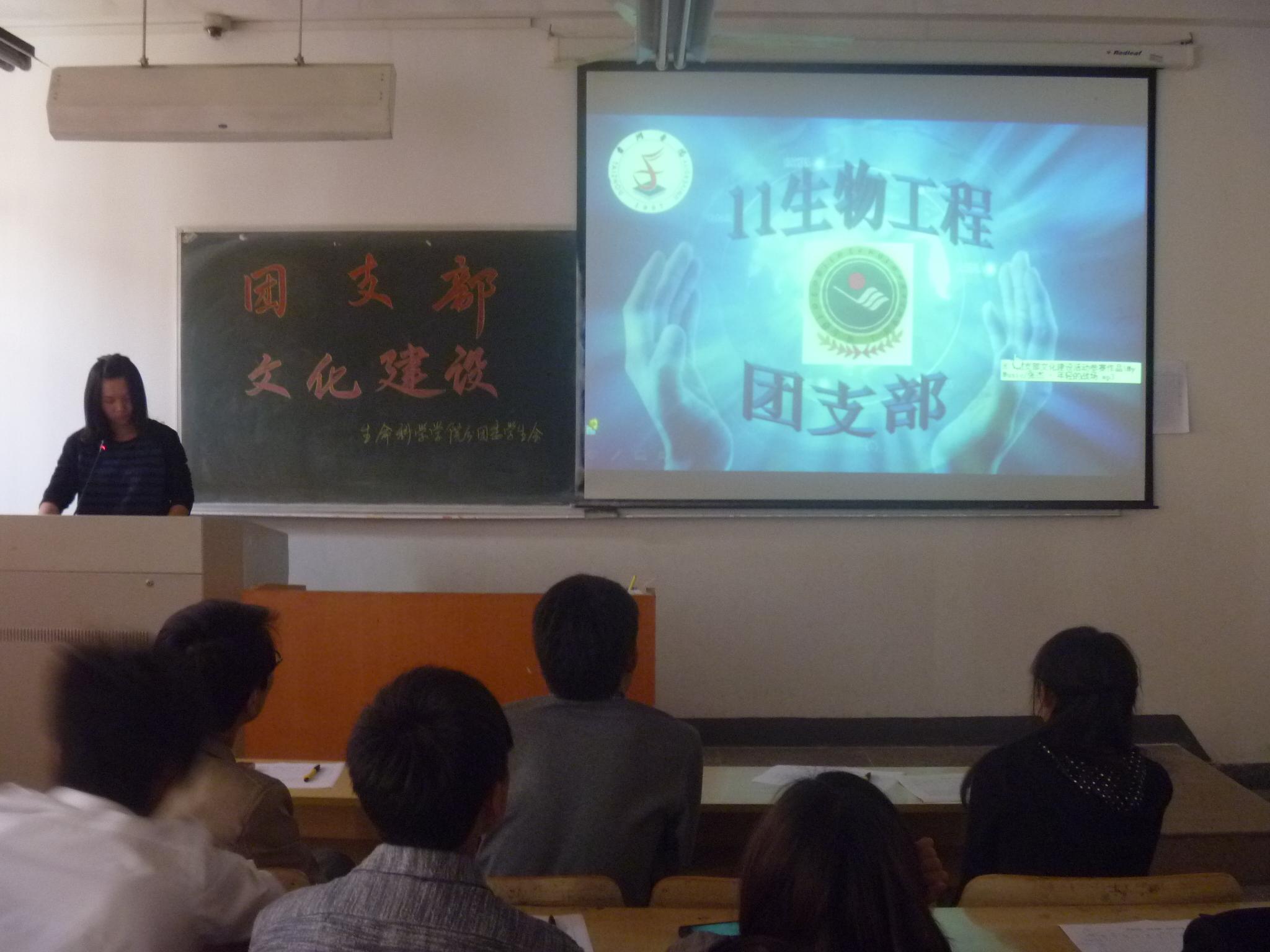 此次活动针对11级团支部展开,由“团支部风采展”与“团支部生活秀”两部分组成。活动现场,11级各团支部首先向评委展示了其色彩华丽、个性突出的支部海报,设计专业鲜明、寓意深刻的班徽,向大家充分传达了其积极进取、刻苦向上的团支部文化精神。随后,各班团支部通过PPT与视频相结合,展现大学活动的精彩片段,秀出大公司园的美好景象,定格老员工活的美丽瞬间,并以此传达团支部多彩的精神文化内涵。最后,11生物教育团支部凭借其造型独特、寓意贴切的班徽,“乐学·善思·笃行”的支部理念,自然贴切、精彩纷呈的视频短片获得此次活动的冠军。