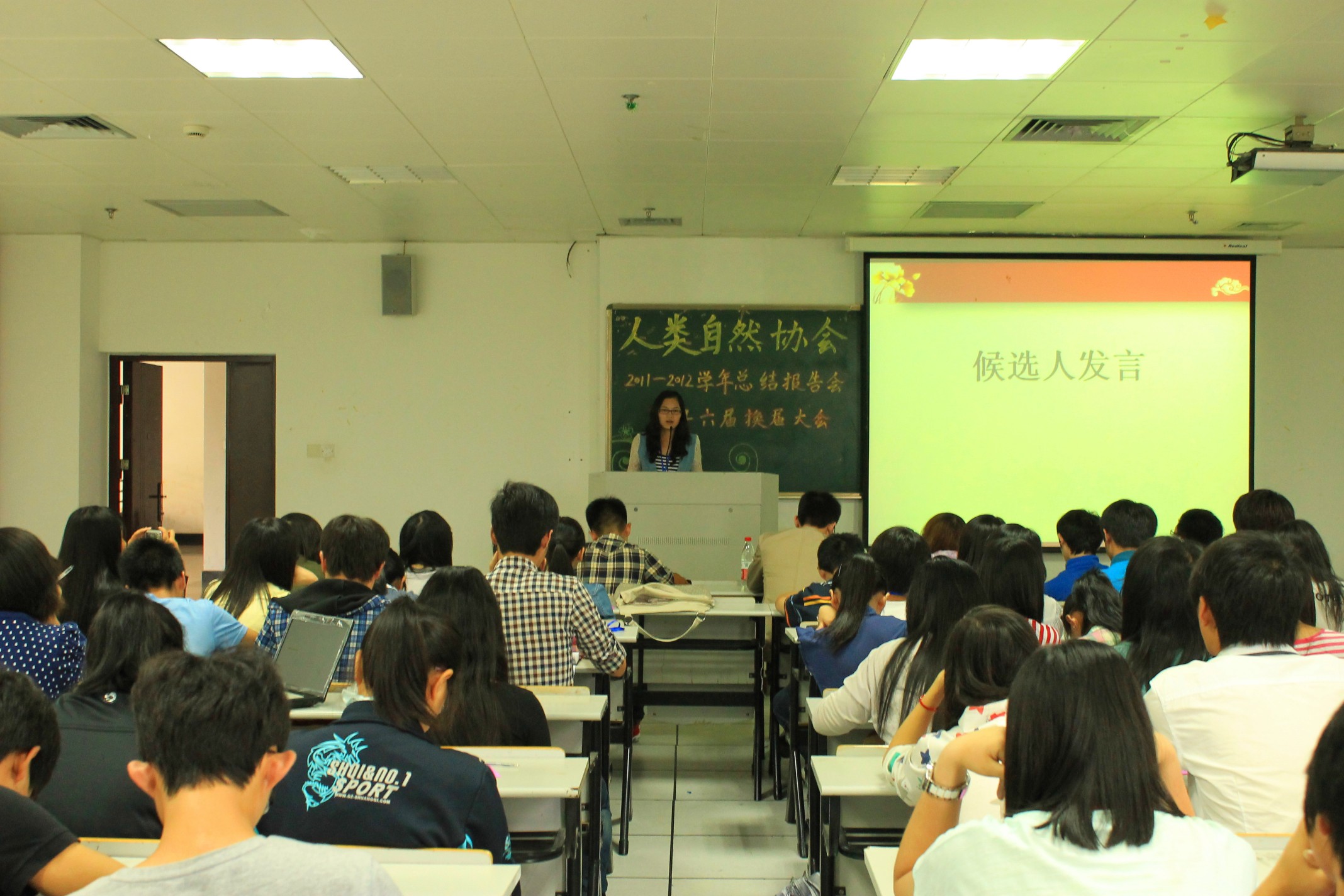 大会伊始,翁添富老师发表讲话,对协会一年以来的努力和付出表示充分肯定,也期待协会在同学们的共同努力下再创辉煌。随后,会长孙旭美以电子书的形式,围绕“立足专业”、“服务全校”、“走出校门”三大主题,向同学们展示了协会一年来开展的各项活动,并做了工作总结汇报。随后,精彩的竞选正式拉开帷幕,在3分钟的即兴演讲中,27位候选人介绍自身特长、畅谈心得,都表达出继续奉献协会的决心。最后,大会以无记名投票选举的方式产生休会新一届理事候选人。大会各项议程在庄重而热烈的气氛中圆满结束。