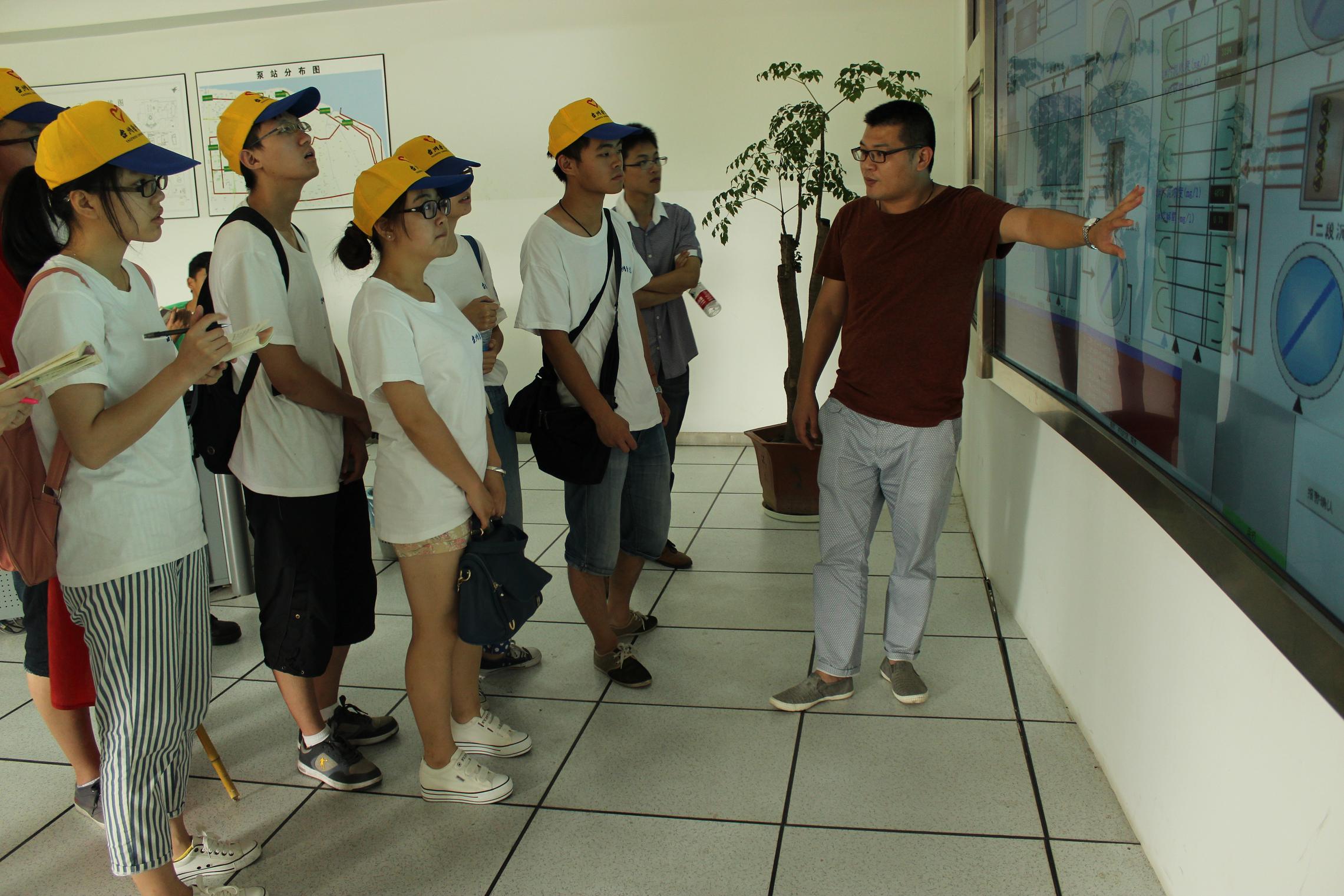 此外,在工作人员的带领下,实践队员们还参观了配水井、二段生化池、曝气生物滤池、二段沉淀池……工作人员采用语言与手势相结合的形式,生动形象地向实践队员们讲解了各仪器的相关构造以及它们的工作原理。“那长管中流出的黄色液体是什么?”细心的实践队员发现这一现象向工作人员提出了疑问。“那是絮凝剂,目前污水治理中应用最为广泛的一种药剂,加速分离,使污水处理更加有效。”通过工作人员的一路热心讲解,实践队员更是了解到了从生活区、工业区排放的污水,再经二段生化池厌氧区、缺氧区、耗氧区三区的洗礼到达二段沉淀池最终才得到达标的可排入海的“下水”。这些污水处理的难度和精湛的技术工艺越发让志愿者们相信,环保事业将任重而道远。