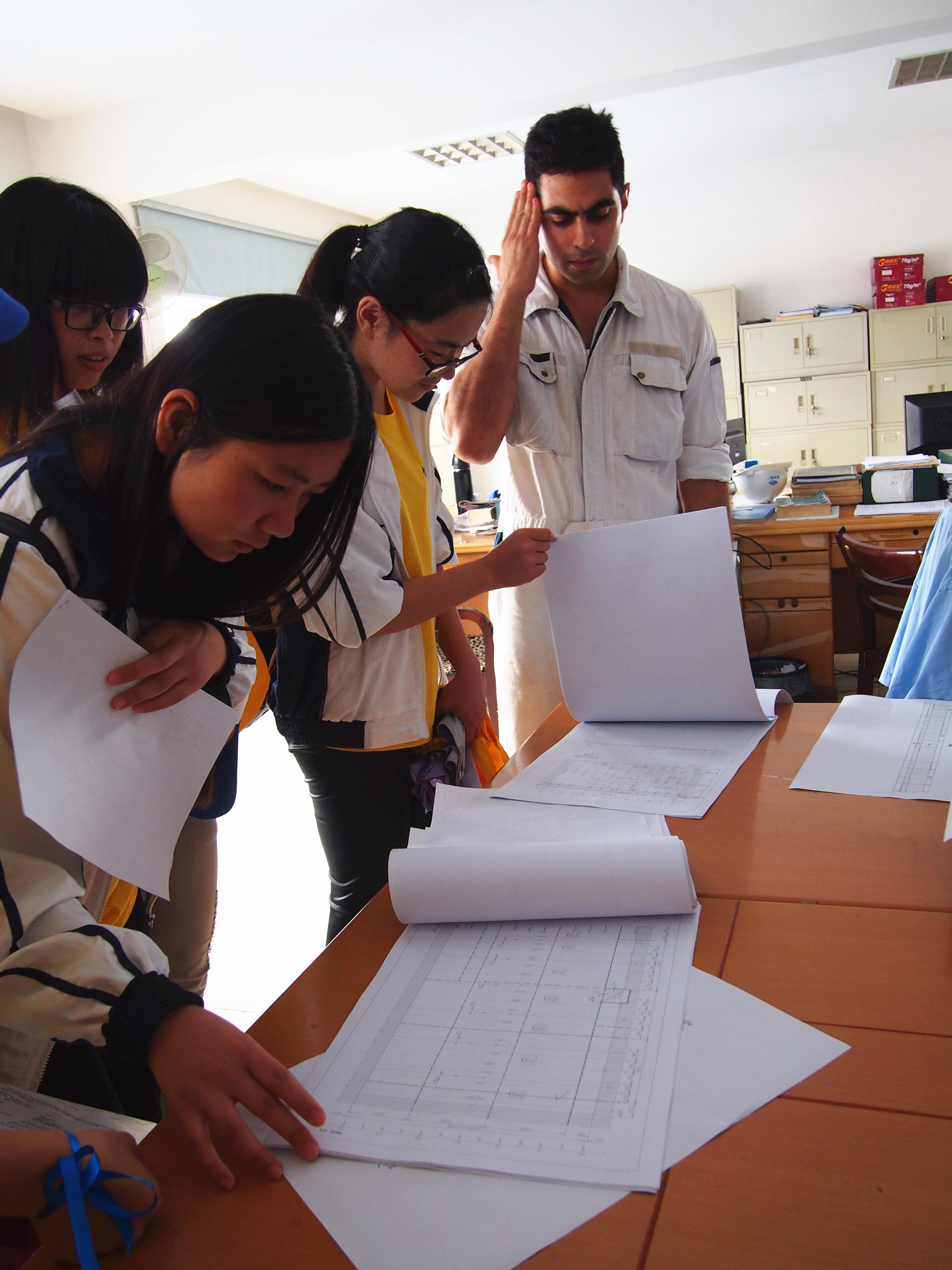 踏入造船厂,在喷砂涂装房中,工人们都戴着防尘防毒面具对分段船体进行除锈工作,并对钢板刷上四到五道漆,做到防锈。在露天工作场地上,正在拼接一艘高11.2米,宽28米,长160米,净重200多吨的油轮,现场非常宏大。阿瑞斯介绍说制造一艘小船就要六个月,而一艘大船则需要一年的时间,船的制造是一系列精细活的组合,误差必须要控制在千分之一以下才能保证安全性,同时各种材料的不同操作也要维持船的稳定性。实践队员对这些工作在一线的技术工人们和在背后提供创意技术的工程师们抱以深深敬意。