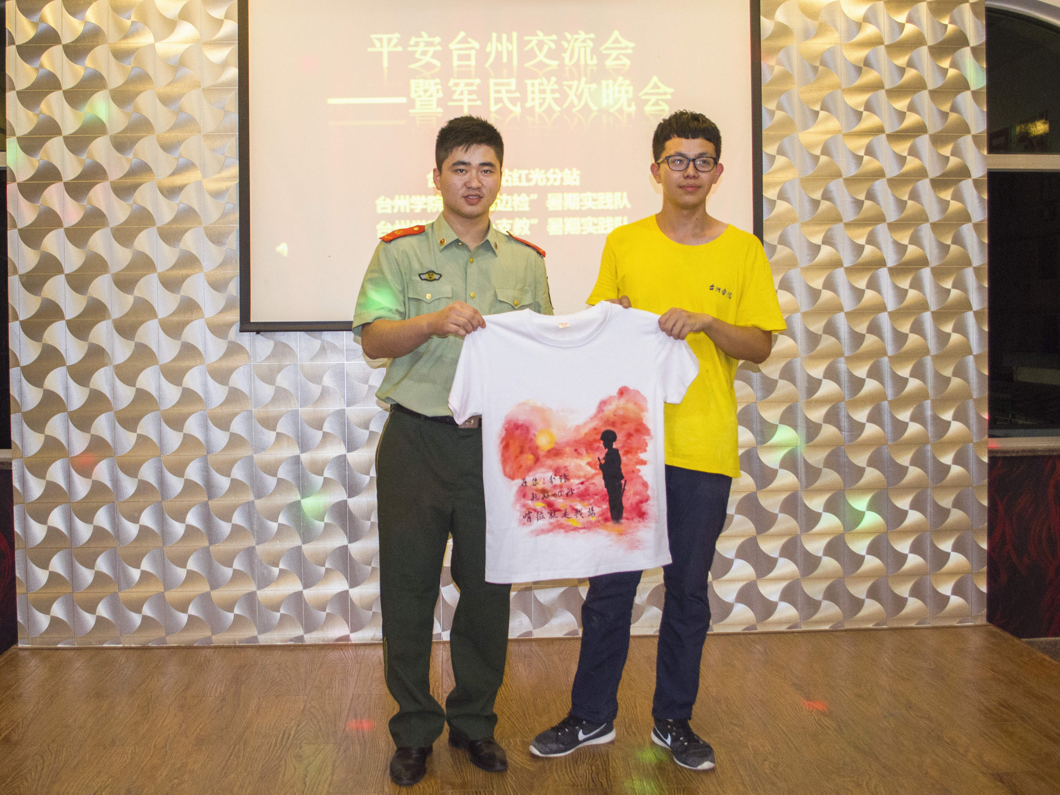 晚会接近尾声时,台州边检站红光分站的战士代表发表讲话,表达了对小朋友们的美好祝愿,表明边检战士将时刻为国家、为社会,坚定自己的使命,对岗位不离不弃的决心。“阳光边检”暑期社会实践队队长卢玺丹对台州边检站红光分站这段时间对实践队的帮助与支持表示感谢,并且为台州边检站红光分站送上由“阳光边检”实践队队员的手绘T恤,为“阳光边检”暑期社会实践队的实践活动画上圆满的句号。