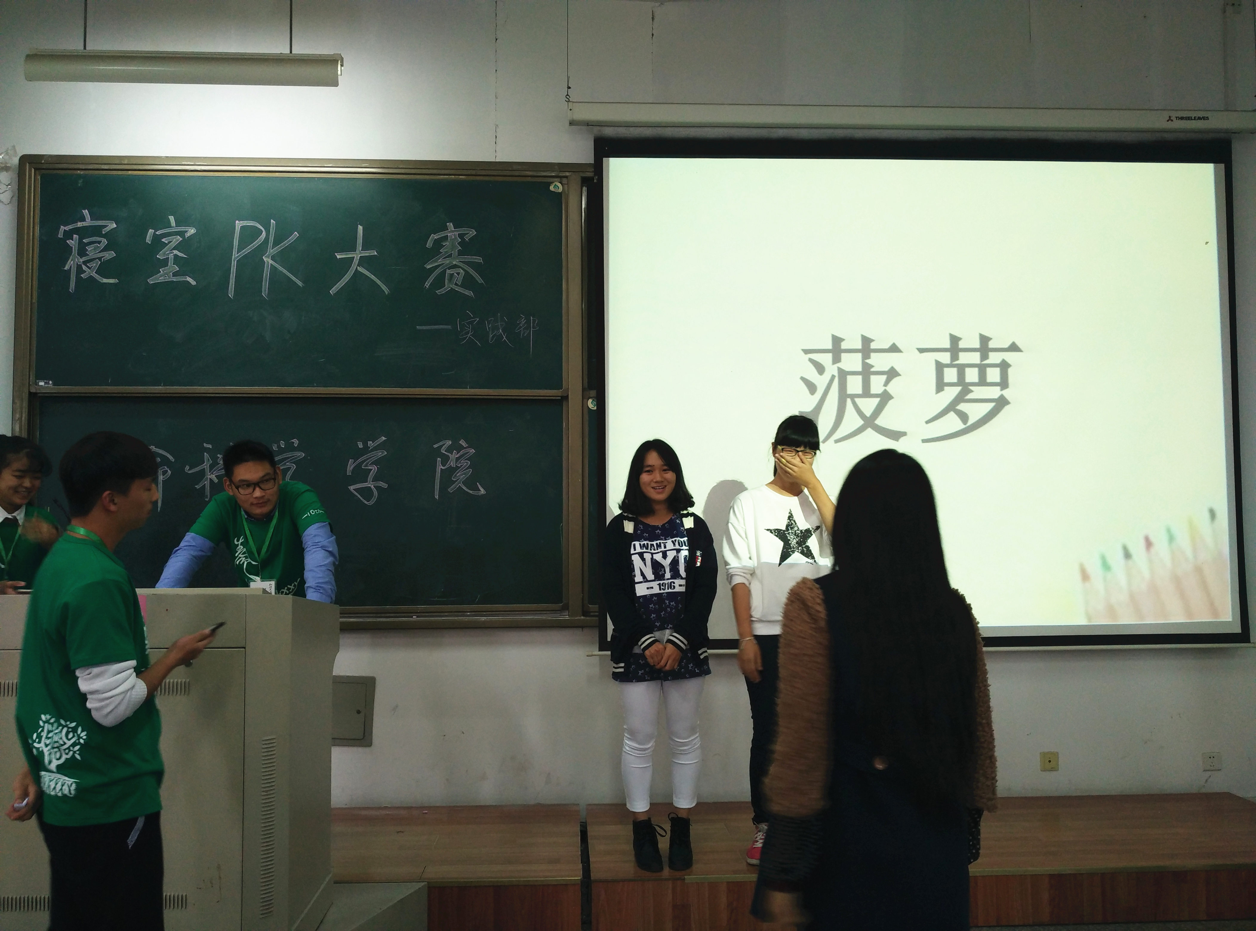 本次比赛分为三轮进行,共有26组寝室参加此次活动。首先考验大家的听力环节来了-“听歌识曲”,顾名思义就是听歌曲前奏猜歌名。熟悉的旋律响起,现场的小伙伴们冥思苦想。第一轮紧张的环节结束后,16支幸运的寝室团队进入第二轮比拼,有趣好玩的“你划我猜”游戏瞬间点燃现场欢快的气氛。一人比划两人猜,考验的就是寝室人员之间的默契度。动物、人物、家电、成语,各种不同的物品被同学们演绎得惟妙惟肖,搞怪动作接连不断,大家忍俊不禁。其中默契度最高的一个寝室团队更是猜出全部名词,让所有人惊呼不已。愉快的游戏之后便是残酷的淘汰,最终8组团队进入最后一轮的终极PK赛。每队派出四名队员参加知识抢答,采取8组团队轮番比拼模式。题目信息量巨大,包括天文地理,古今中外名人轶事,同学们开动头脑风暴,争相抢答,答对的欢呼雀跃,答错的懊恼丧气,赛事进入白热化程度。最后,10-214寝室团队披荆斩棘夺得桂冠。在欢呼声中,此次寝室PK大赛完美收官。