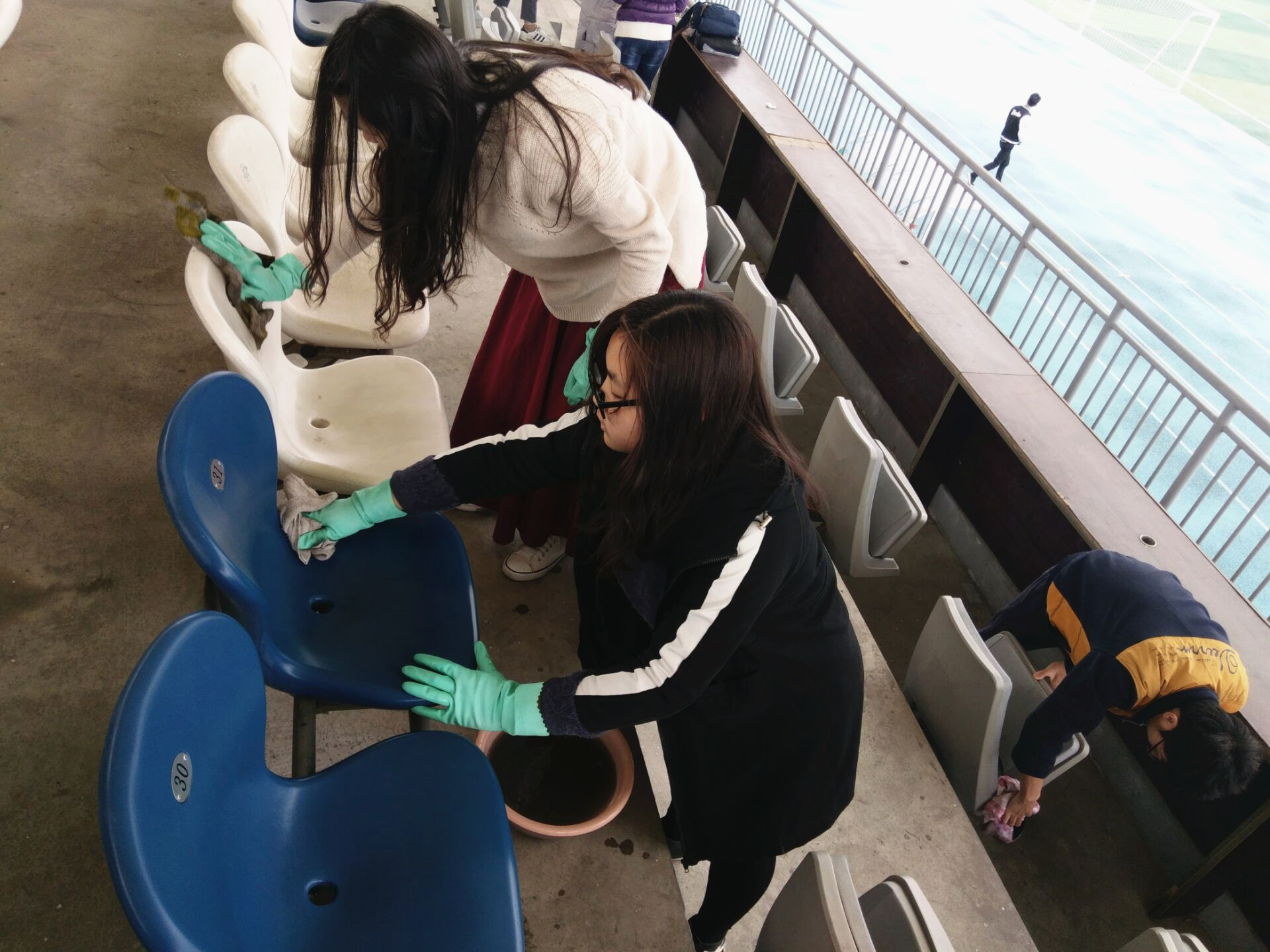活动现场,同学们积极参与大扫除,分组打扫看台不同区域。大家分工合作,积极踊跃、不畏脏不怕累,配合默契。有捡垃圾的、有换水的、有擦座椅的。每个人都忙得不亦乐乎,清洁活动进行得火热朝天。操场上不时传出同学们愉悦的笑声。水换了一盆又一盆,白抹布也已经变成黑布,但在大家的齐心协力下,看台上的椅子干净了,地上垃圾也没有了,顺利并完满的完成了这次大扫除活动。