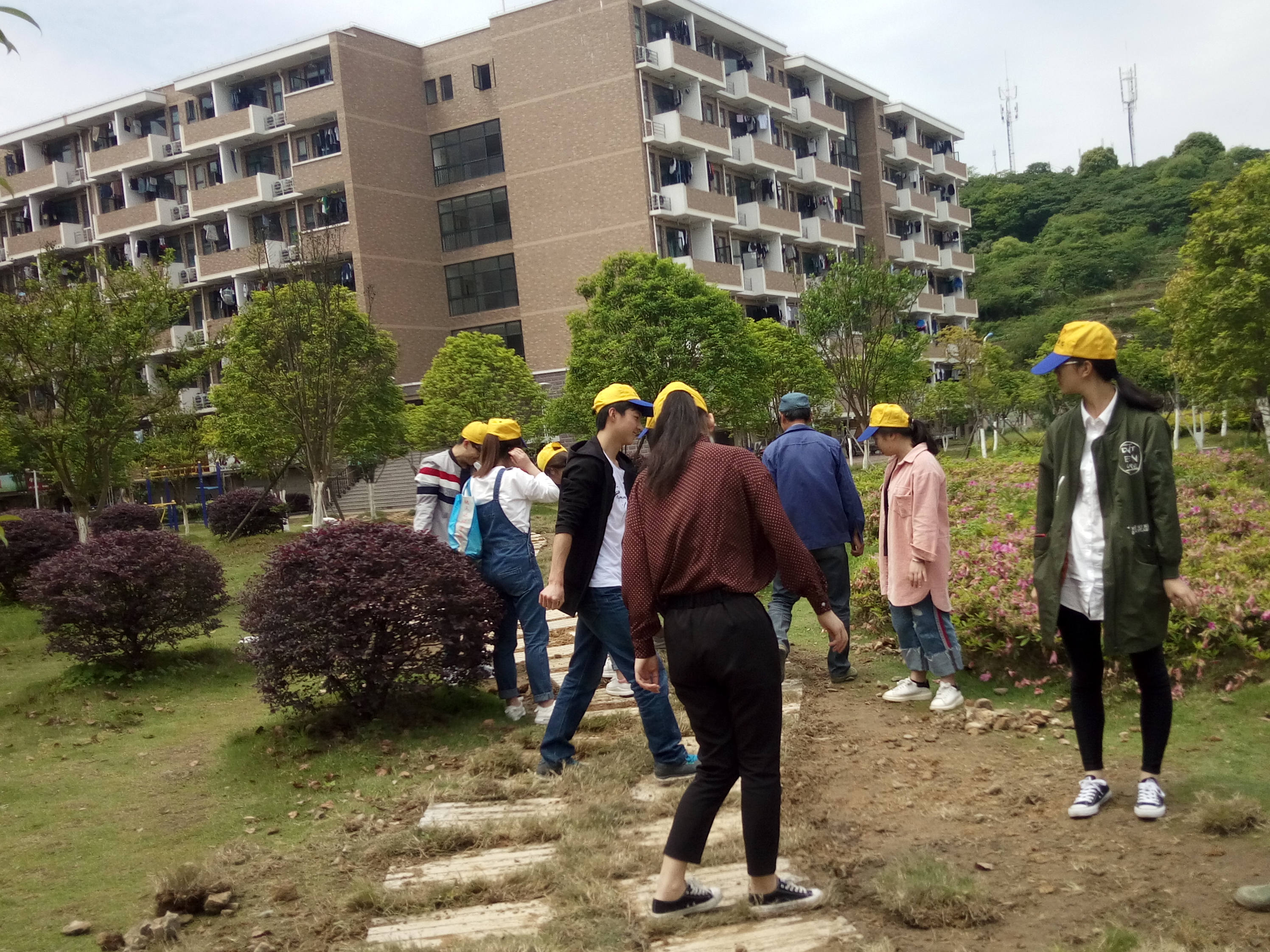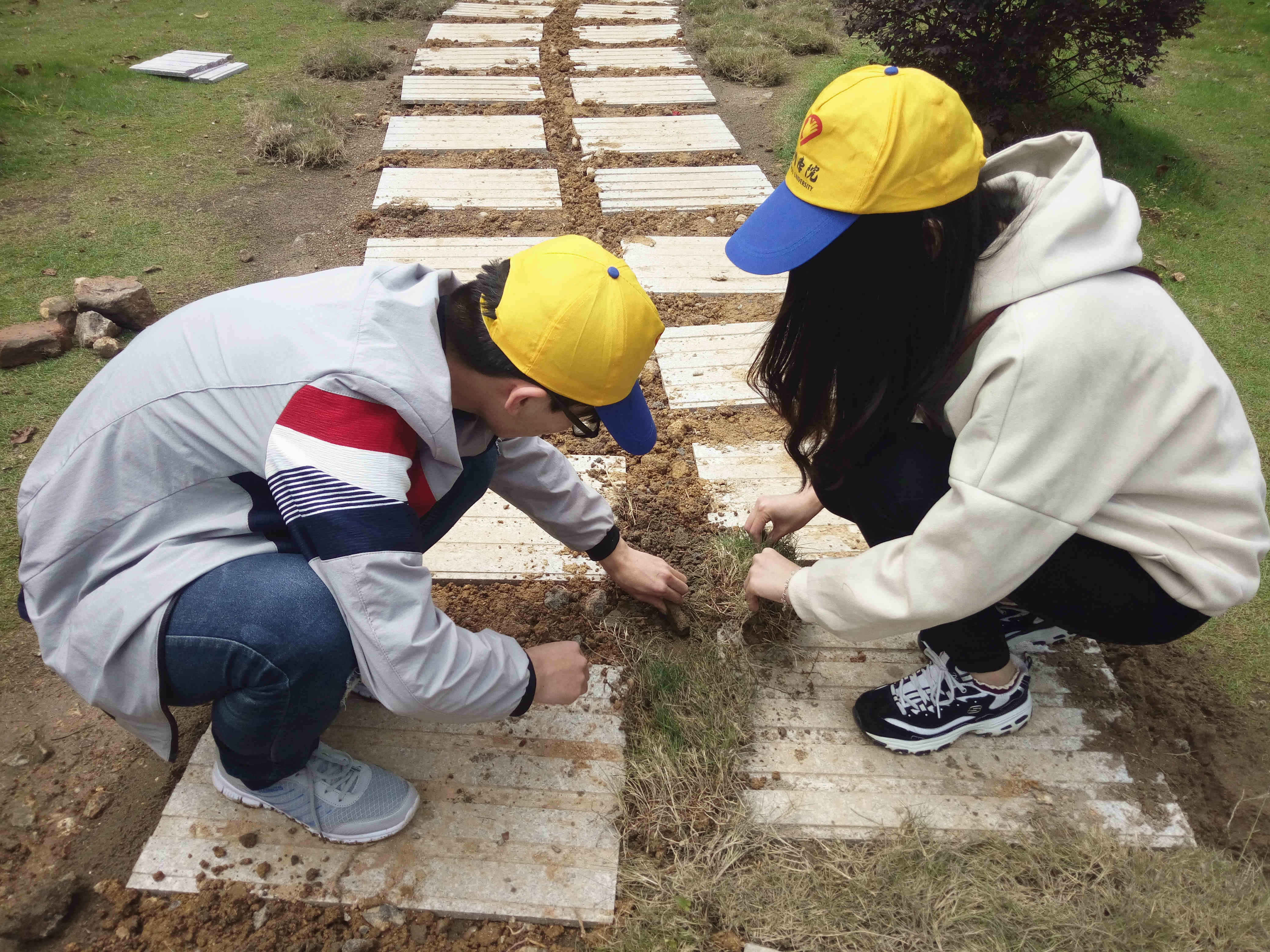 当天,志愿者们顶着烈日将宿舍到教学楼的一段“小路”铺上石板,接上草皮。同学们手握工具,搬移材料,将石板一块块铺在裸露的泥土上,并在接缝处细心地铺上草皮,让原先满是黄土的烂泥路焕发生机与活力。此外志愿者们还将其他几条被同学们踩坏的草坪铺上草皮,重新原来的风貌。志愿者们认真劳动,汗水布满了脸颊,成了校园里一道靓丽的风景线。