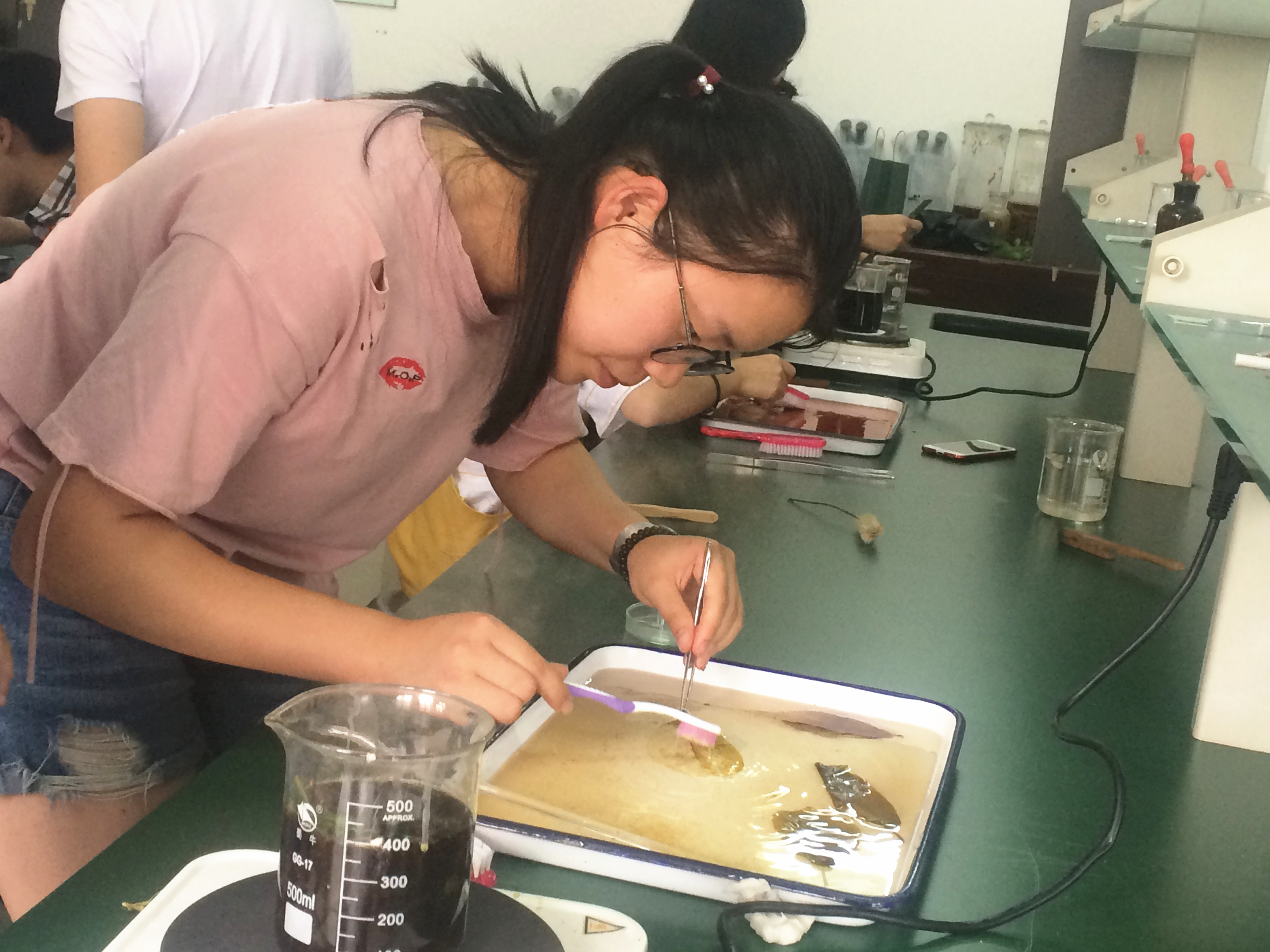 看似简单的操作,却体现着细心和耐心,参赛选手们在实验室里需用氢氧化钠加热腐蚀各种植物叶片、刷洗叶片除去叶肉、化学试剂漂白、醋酸洋红或亚甲基蓝染色,再进行固定、压干、定型……制作过程中不时有选手因掌握不好力度导致树叶破裂,不得不从头再来。在不断尝试下,最终每个同学都成功完成了属于自己的叶脉书签作品。同学们还发挥自己的奇思妙想,结合书法、绘画等元素,巧妙利用叶脉形状为书签绘制了独特的背景装饰,给普通的叶脉书签增添了艺术效果。