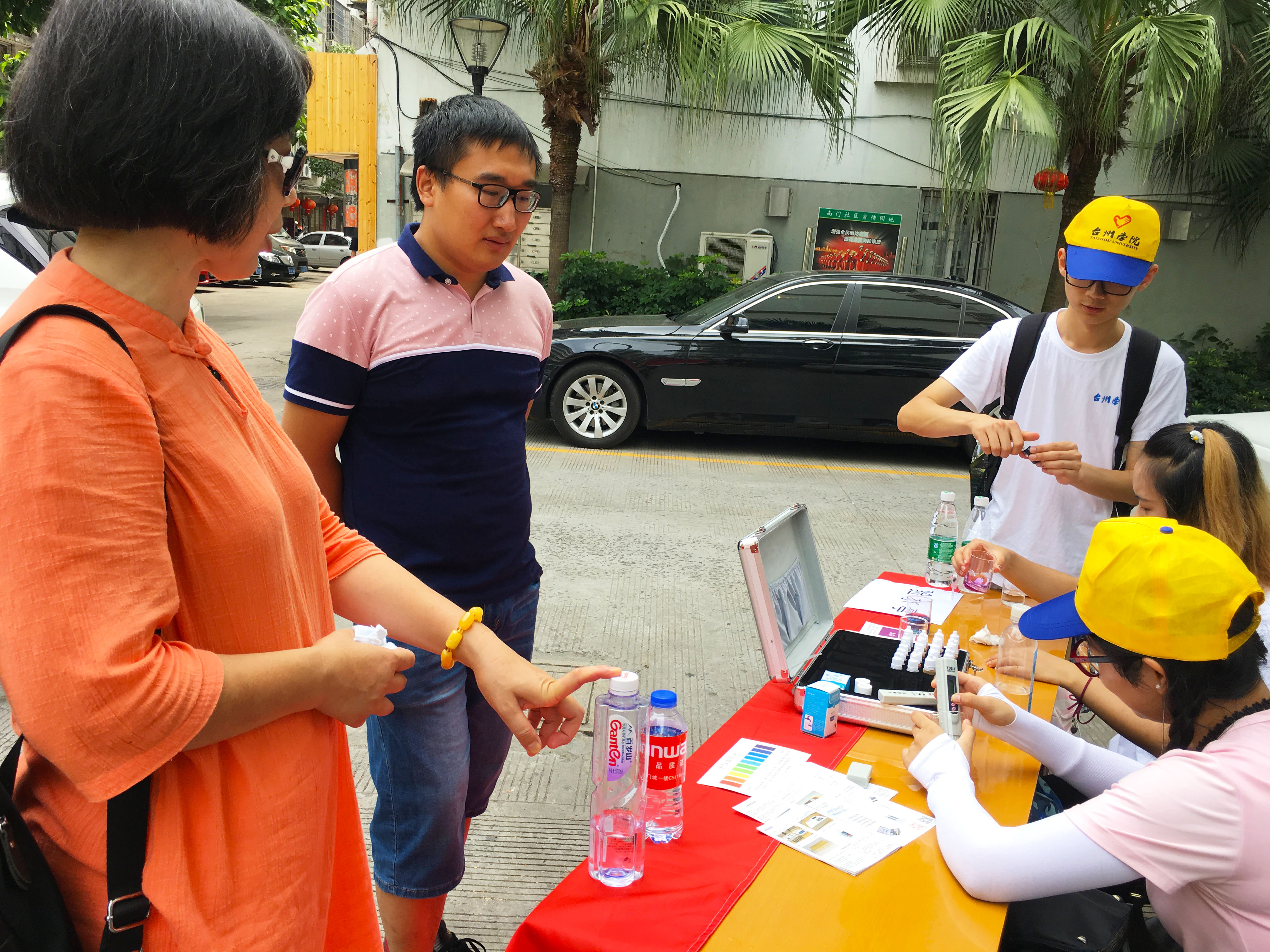 上午8点,实践队在医化公司娄柳柳老师的带领下与团委叶天益副书记对接,在南山社区设立验水亭,为小区居民检测自来水水质,主要针对pH值、液体TDS、所含矿物质含量以及余氯。小区居民们积极参与,配合检测人员的工作,得到的检测结果为TDS(固体悬浮物)20~30ppm,矿物质20~50ppm,pH值为弱碱性,余氯含量0~0.1ppm,自来水一般都检测出来都含钙镁离子,属于正常范围。针对不同居民家中水质情况,实践队队员们给予了居民不同的改进建议和措施。据居民多数反应,每楼都有一座专门的水塔,但由于没有得到及时的清理,有些水塔中出现生锈情况,使得许多居民家中水质出现问题,建议居民养成在情况允许下勤清理的好习惯。实践队在检验水质的同时也进行了对验水活动的宣传及问卷调查。大多居民认为五水共治提高了他们的生活质量,他们也非常支持五水共治的政策。