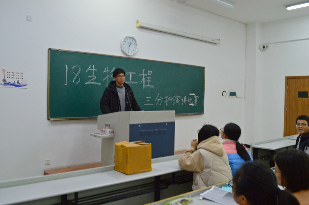 为了检验课前三分钟演讲的效果,11月18日,18生物工程班举办了三分钟演讲比赛。共有22名同学参加了比赛,全体同学通过投票的方式选出了10名优胜者。