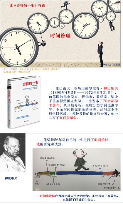 人最宝贵的是生命;但是仔细分析一下这个生命,可以说,最宝贵的是时间。《奇特的一生》讲述了一个将自己的一生用时间来计划的人——柳比歇夫。柳比歇夫时间统计法即日期+事件+花费时间:先定一个对自己而言的伟大目标,然后想尽一切办法真正了解自己、真正了解时间、精确感知时间,而后想尽一切办法使自己的行为与时间“合拍”,并且不断做月、年总结,以此检查自己的工作效率。