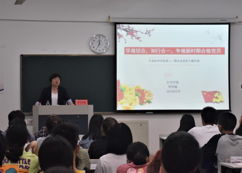 党课上,李钧敏围绕“两学一做”学习教育常态化制度化的总体要求、目的意义和主要内容展开阐述,强调“学”是基础,“做”是目的,要求学员们坚持问题导向,带着问题学、针对问题改,把学和做统一起来,在知行合一中,切实将党章党规和习近平新时代社会主义思想内化于心、外化于行。她指出,各位入党积极分子要以“四讲四有”合格党员标准为标杆,既要志存高远,又要脚踏实地,以实际行动努力向党组织靠拢。课后,她还与学员们积极互动,通过现身说法,帮助学员们进一步理解了学做结合、知行合一的深刻内涵。