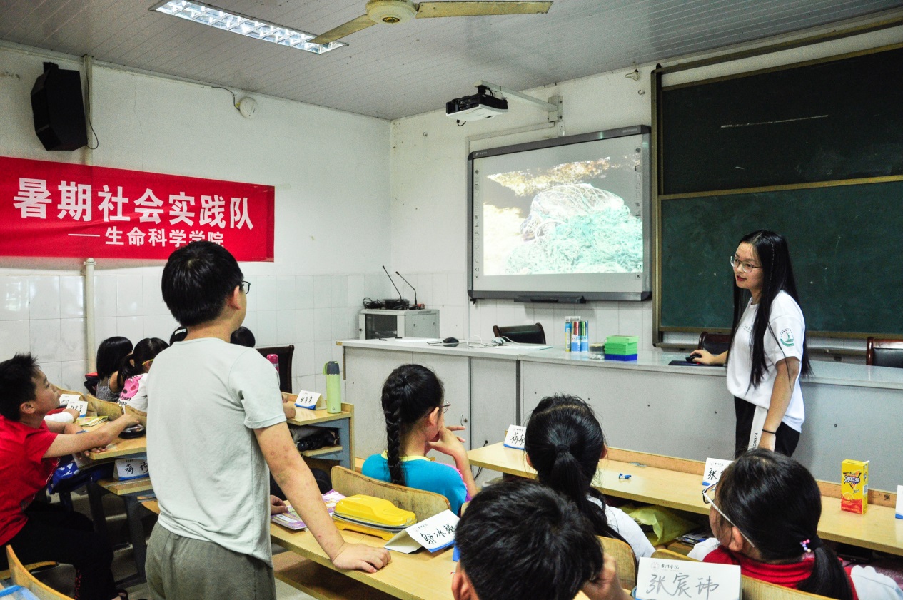 在进行简单的自我介绍之后,“海洋之心”实践队员从中国的海域、美丽海洋风光、富饶美丽祖国岛屿,一步步引领孩子们进入了海洋的世界。随后,以一个海绵宝宝的故事引发孩子们对海洋污染问题关注。“海洋之心”团队呼吁减塑生活,孩子们积极踊跃发言,认真参与课堂活动,同时也为保护海洋环境提出自己的小小建议。第二堂课,实践队员由海洋生物引入课堂,到救助海洋生物的真实案例,再到禁渔期的相关知识,引导小朋友们对海洋资源与生态保护产生思考。临近结束的提问抢答环节,将本次课堂教学推向高潮,一双双高高举起的小手,一次次令人赞叹的回答和热烈的讨论氛围都使实践队员们感到十分欣慰。最后,实践队还为小朋友们送去纪念品。