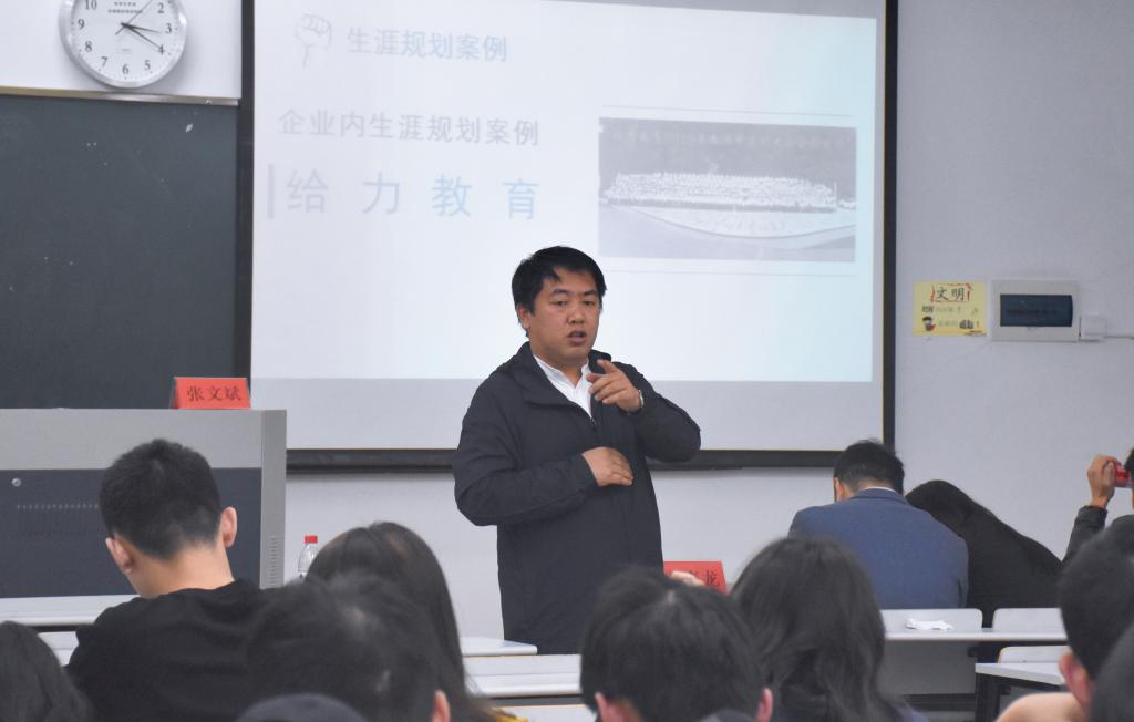张文斌以“从老员工到行业精英,你准备好了吗?”为主题,结合自身职业发展经历和当下青年老员工的生涯规划现状,提出“现在的你是否了解所学专业的就业情况以及需要哪些知识或能力?”等生涯规划“三问”,通过讲述给力教育集团的文化内涵、发展历程、用人计划、战略目标及相关真实案例,以深度互动、深度拷问、深度启发的方式,向同学们阐述了生涯规划的重要性、内生涯在职业发展中的关键性,并勉励大家脚踏实地、勤修内功,仰望星空、胸怀大志,做一个有理想、有情怀,有梦想、有远志的新时代有为新青年。