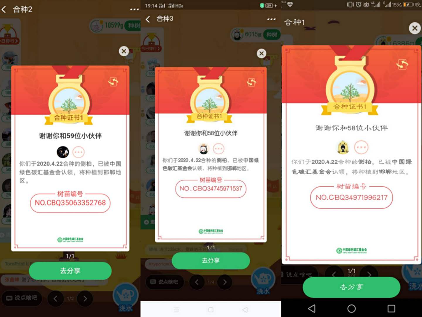 此次活动借助支付宝的蚂蚁森林合种与蚂蚁庄园捐爱心的平台,开展了方式新颖的公益活动,得到了广大同学的热切关注。本次活动共有350余人次参与到蚂蚁森林合种活动,组成了数支合种队伍,参与的同学通过低碳行动积攒绿色能量,完成每天230g浇水量的七天打卡任务,共同浇灌合种树木并最终获取环保合种证书;共有420余人次加入蚂蚁庄园捐爱心活动,参与的同学通过使用支付宝付款获取饲料、饲养小鸡、换取鸡蛋从而完成至少一次爱心捐赠。大家都积极参与,认真对待,最终按时完成了预期的所有任务。