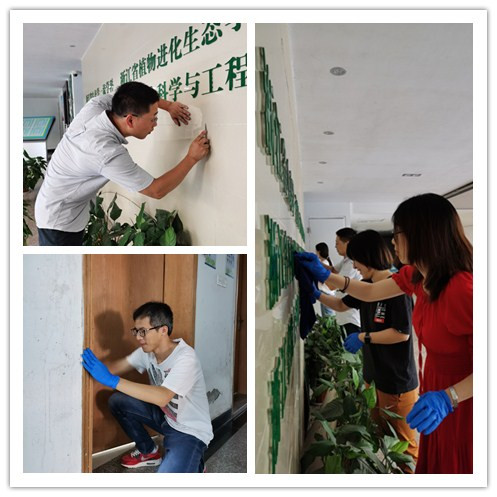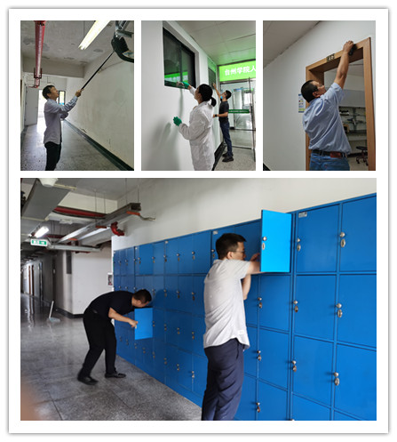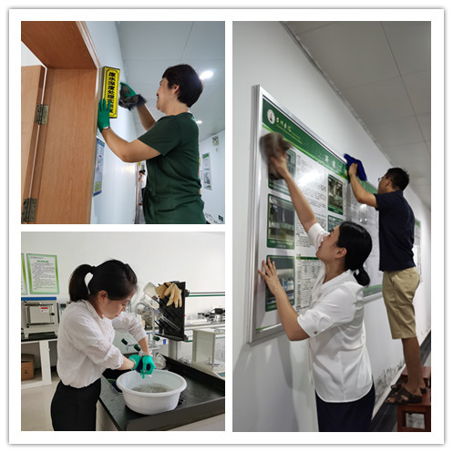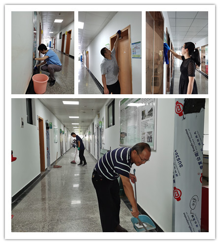 公司四个教工党支部实行楼层包干制,全体教师党员集体上阵,重点聚焦墙面文化广告牌、门框、开关、橱柜以及窗台等卫生死角开展集中清扫。在生命大楼里,大家手持清扫工具,分工协作,整齐有序地开展,他们汗流浃背的忙碌身影构筑了一道亮丽的风景线!