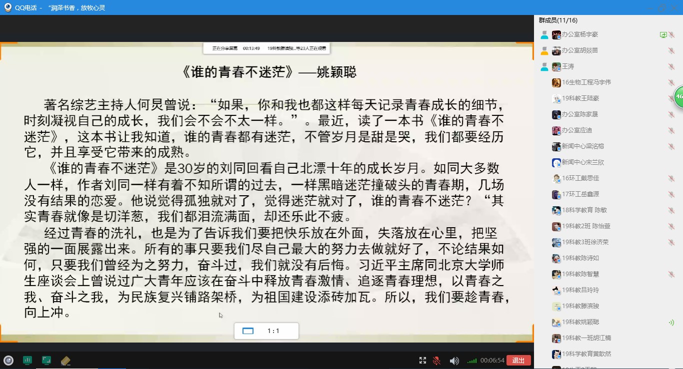 因受疫情影响,活动以线上形式开展,但是同学们的热情不减,每期都有大量同学踊跃报名,围绕给定的主题选择阅读相关书籍,并分享读后感悟。本次活动共开展了3期,主题分别为家国情怀、青春当是时、父母与我。分享会上,同学们介绍自己阅读的书目,畅谈阅读感受,带领同学们走进一部部经典名著,与书中的人物“面对面”。会上,同学们还就书中展现的观点、情感进行讨论,发表自身看法,提出自己的见解,用思维的火花碰撞出美丽的花朵,将读书会的气氛一次次推向高潮。
