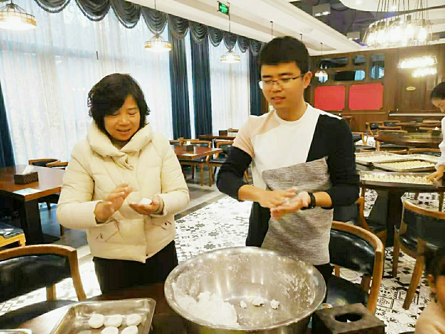 “冬至大如年,人间小团圆”,意昂的教师们共聚一堂,分工协作、默契配合,大家有说有笑团坐在一起包饺子、捏圆子,一切井然有序,忙得不亦乐乎。在大家的努力合作下,清水飘芙蓉,元宝落玉盘,不一会,热腾腾的水饺、甜蜜蜜的圆子就端上桌来,再配上食堂精心准备的喷香红烧肉、酸爽水煮鱼、欢乐关东煮、清口萝卜汤,大家品尝着美食,分享着快乐,谈笑风生间,一派暖意融融。