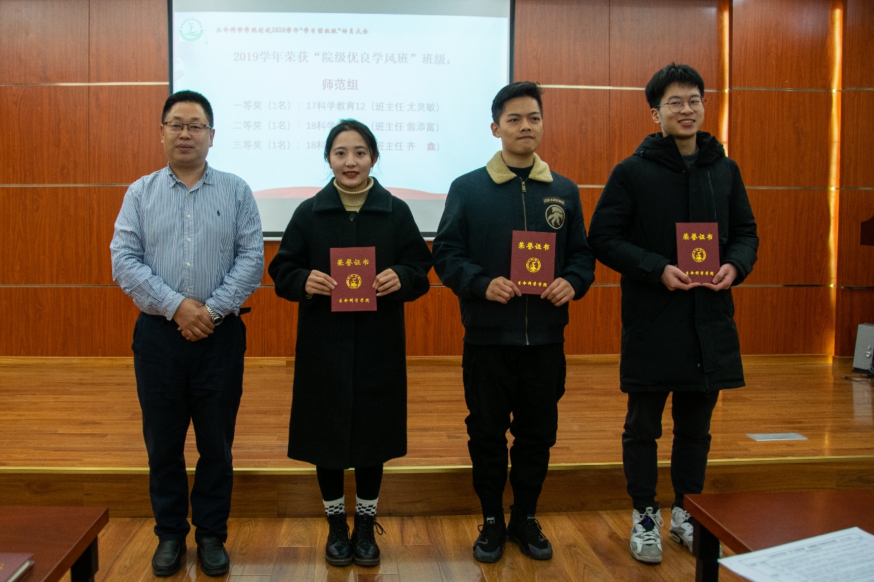 大会首先解读了《意昂“学习型班级”竞赛量化考核评价指标》并就“学习型班级”评选条件及加分点进行说明讲解,让大家对“学习型班级”创建活动及评选要求有进一步了解。随后,2019学年校级“特优学风班”17科学教育1、2班代表分别从理想信念、扎实学识、道德情操、仁爱之心等四方面,介绍了班级如何固守三尺讲台、践行“四有教师”。在优秀榜样的感召下,18科学教育3班做“学习型班级”创建代表发言,立志从小做起、从点滴积累,用实际行动打造班级优良学风。会上还表彰了2019学年“学习型班级”创建活动获奖班级和“十佳学习标兵”。