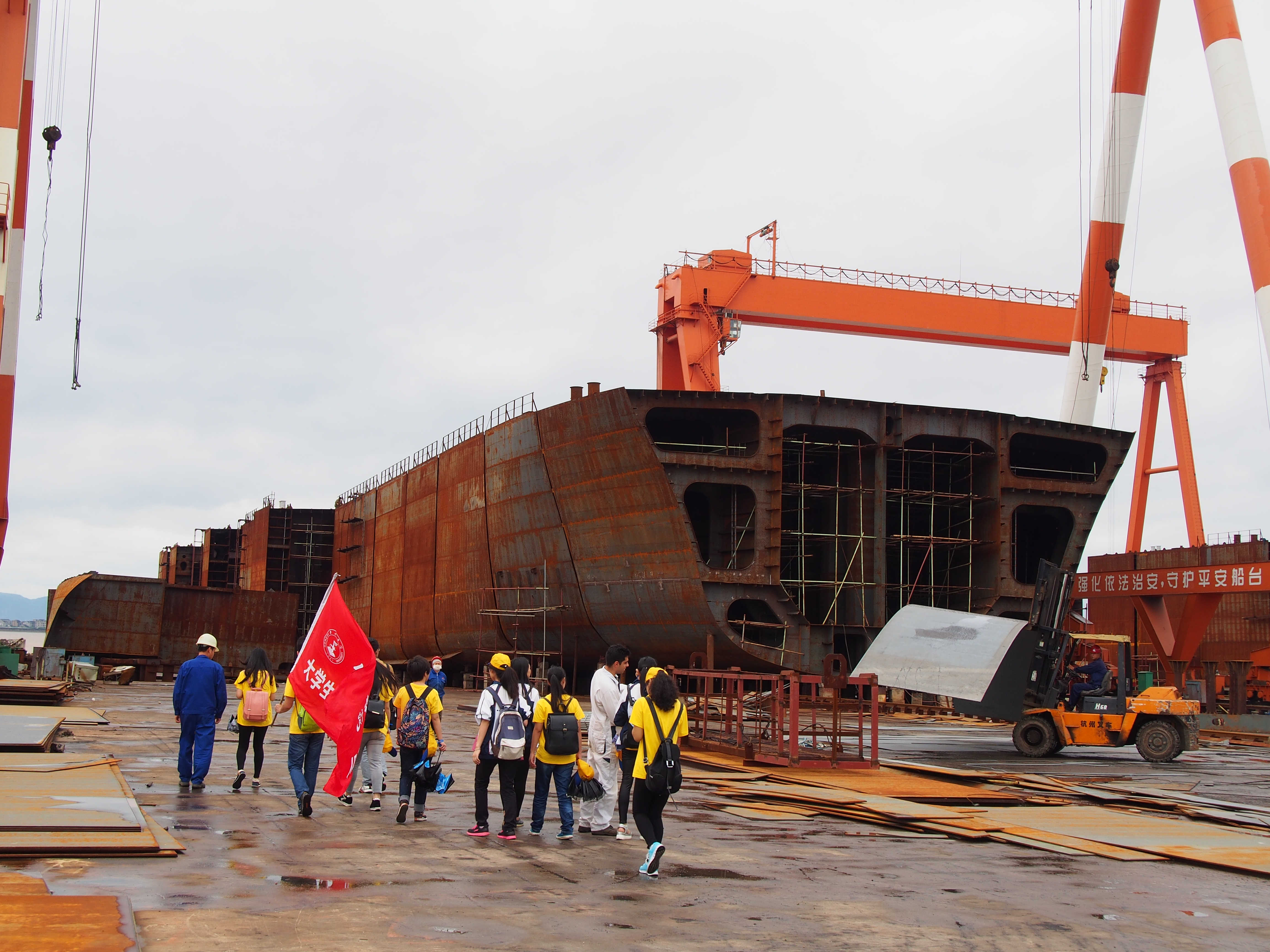 7月7日,意昂体育“海洋之心”暑期社会实践队来到国营海东造船厂了解海洋轮船的制造,希腊工程师阿瑞斯和他的同事带领实践队员参观,并介绍造船知识。 踏入造船厂,在喷砂涂装房中,工人们都戴着防尘防毒面具对分段船...